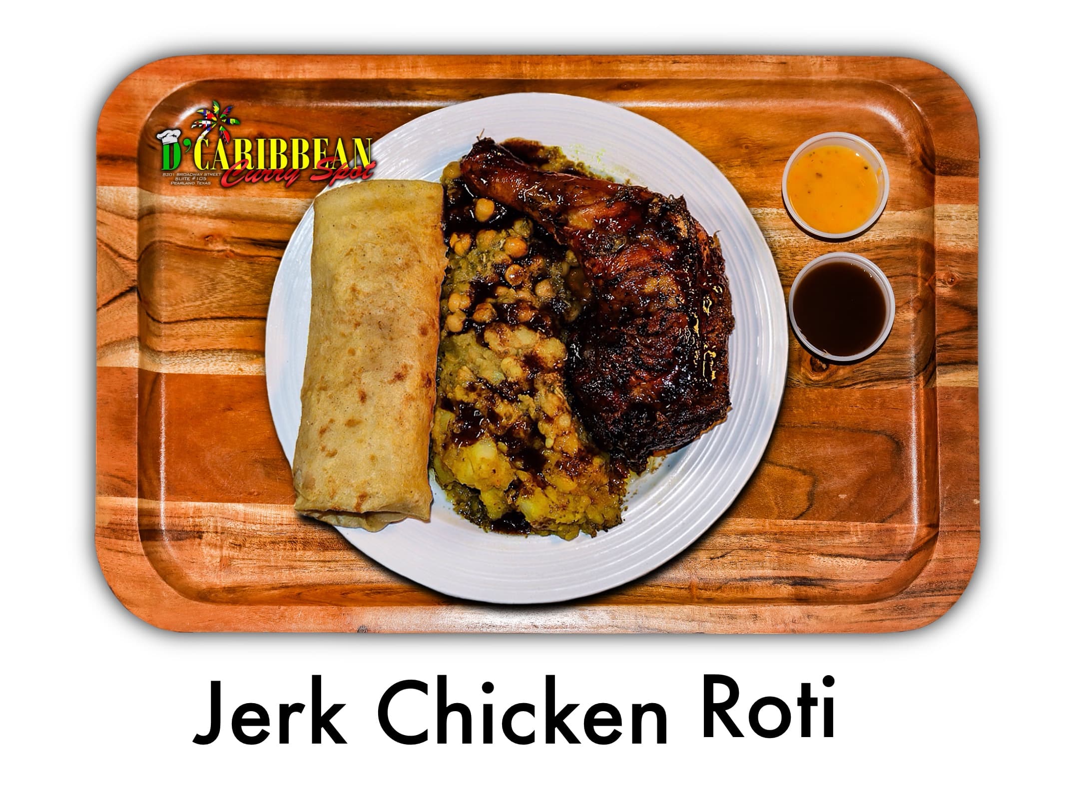 An original Caribbean entree, containing jerk chicken, served with roti, and curried potatoes